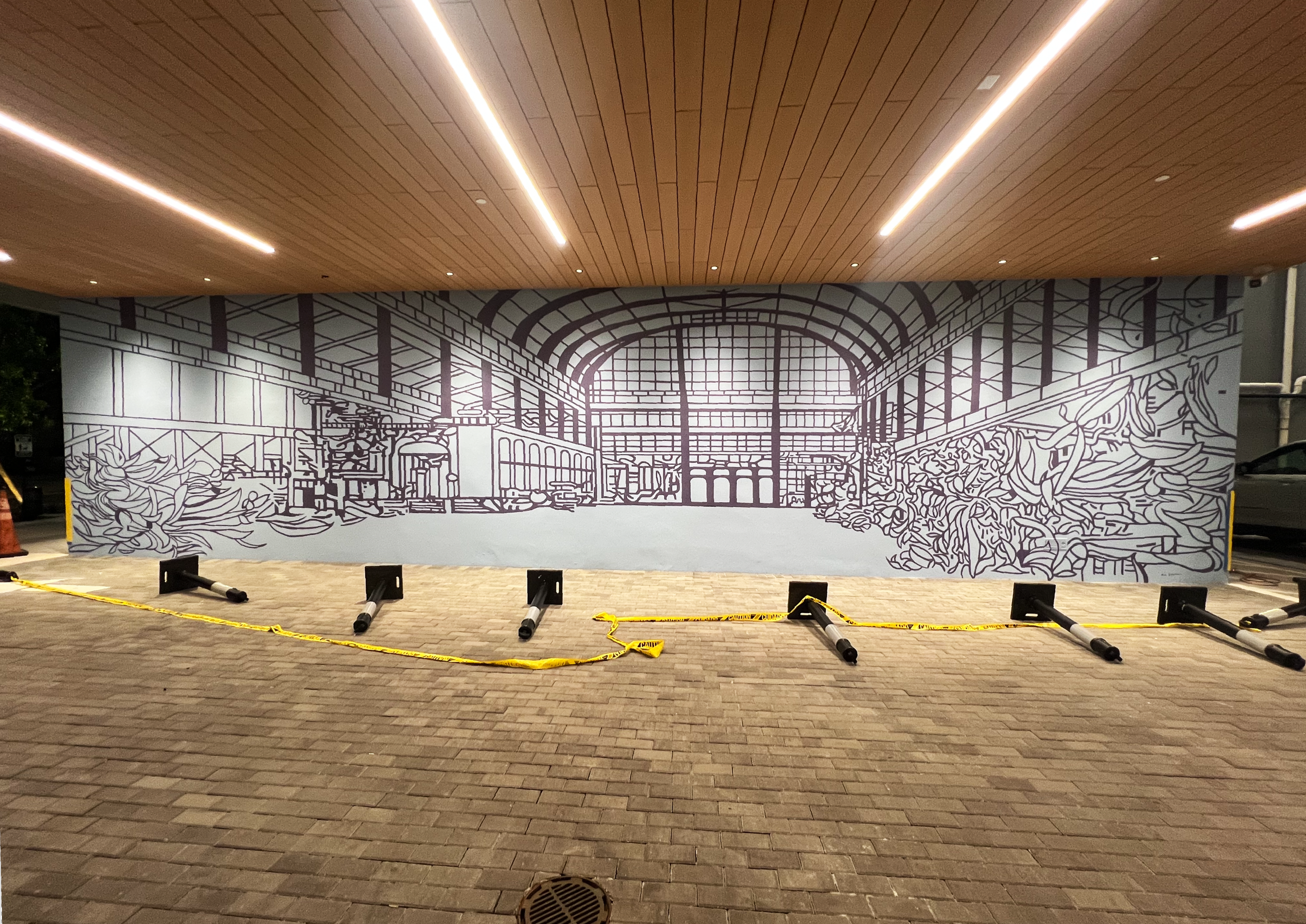 WIP_“The Glass House”, 11.5’ x 50’, hand painted on Stucco. A permanent site-specific artwork commissioned by Avalon Communities through South Miami Art in Public Places Ordinance, 2025 South Miami, FL 2025